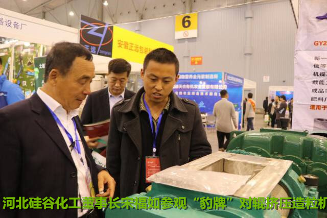 2017年10月27日,衡水隆昌肥料造粒機械有限公司參加了由農業技術推廣服務中心和中國農業技術推廣協會聯合舉辦的第十九屆全國肥料信息交流暨產品交易會,河北硅谷化工董事長宋福如攜公司代表成員,參觀了我公司生產的“豹牌”對輥擠壓造粒機